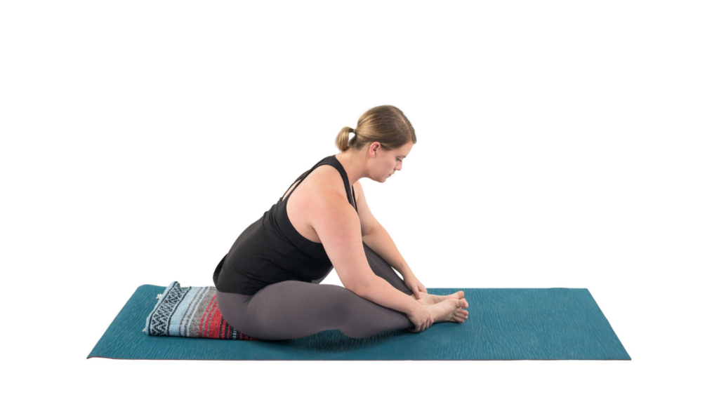 - Lift your heart gently up, then fold forward slowly and carefully—leading with your pelvis, not your waist—either holding onto your ankles or reaching your arms forward and letting your fingers rest on the floor on blocks.